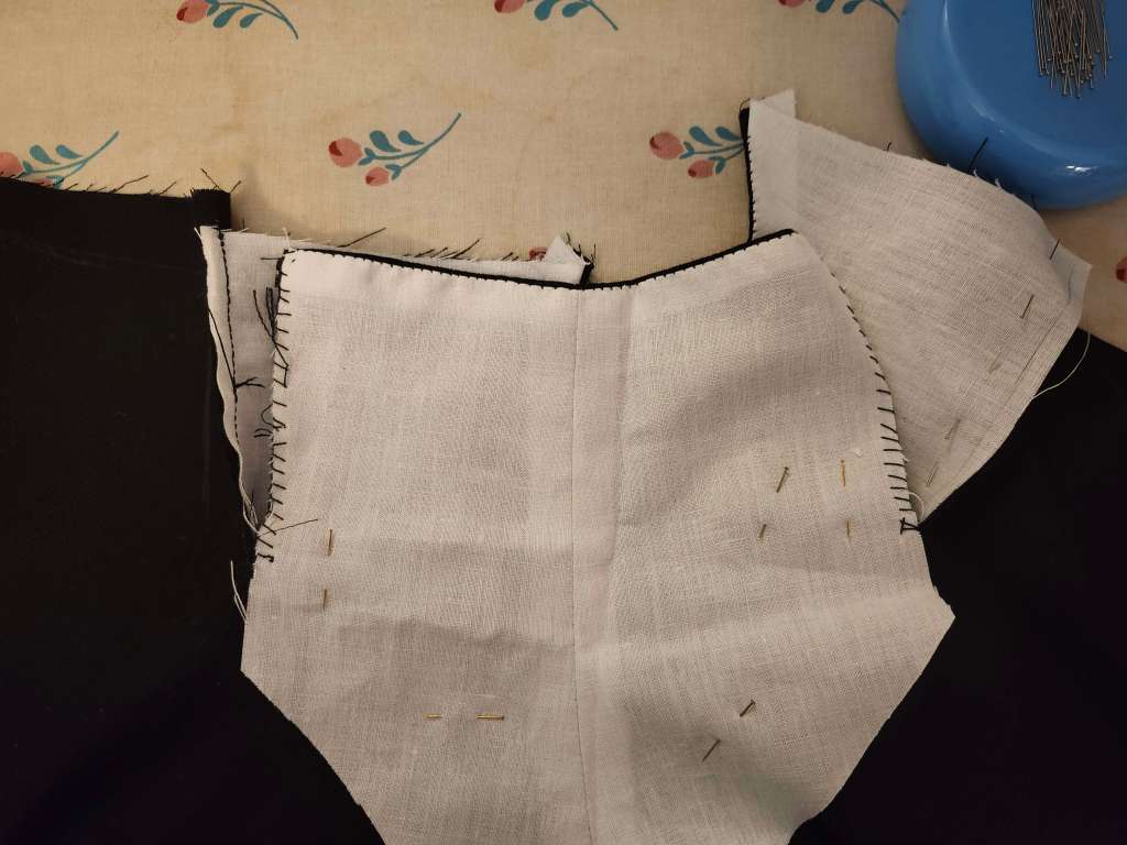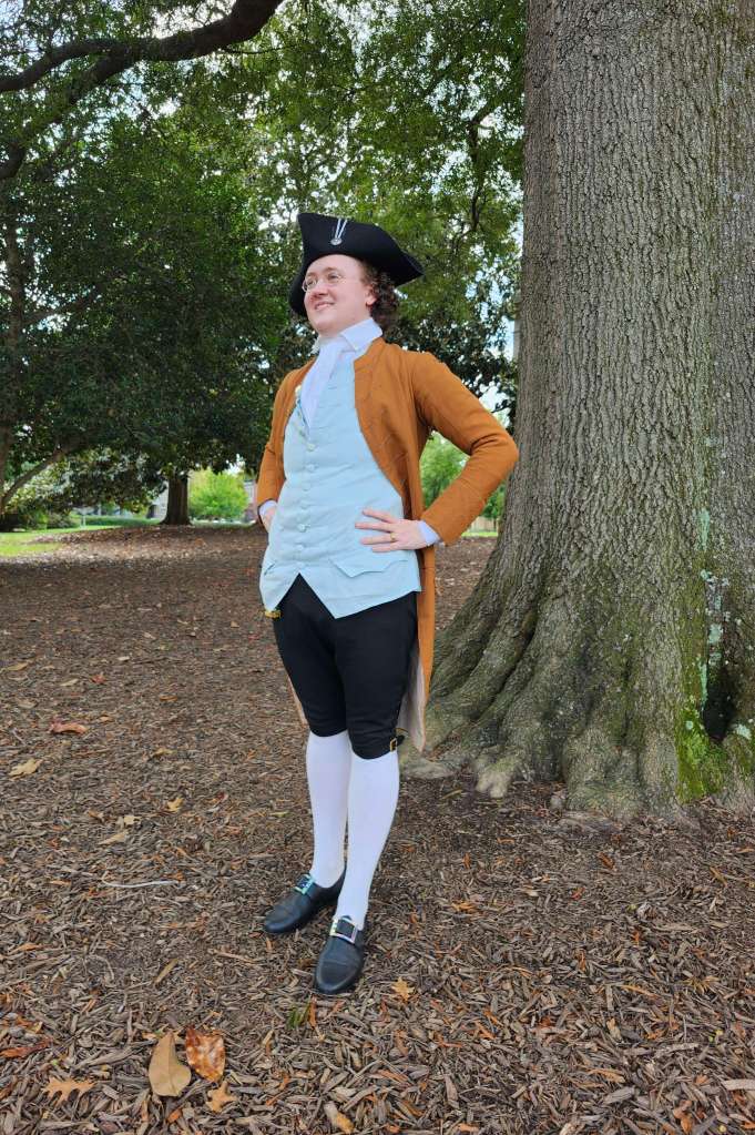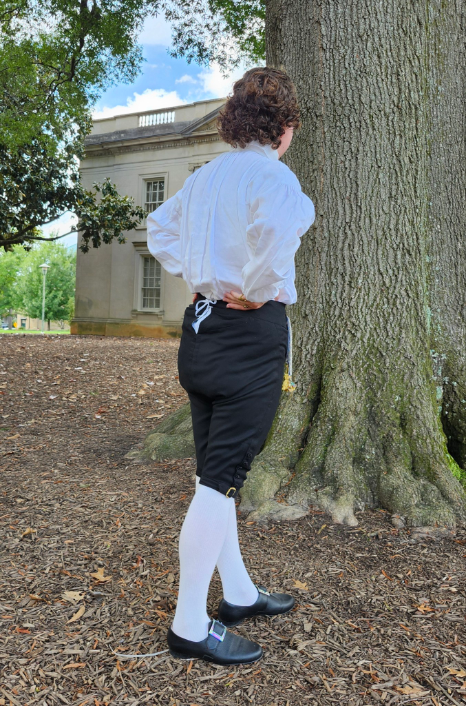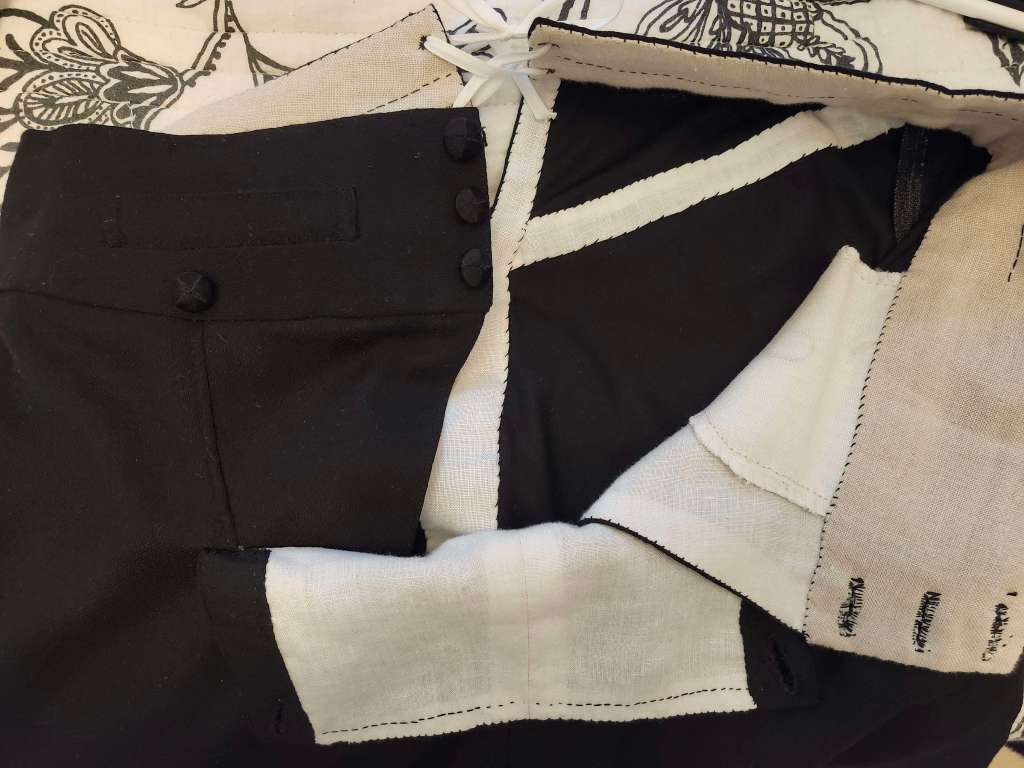 1770s style waistcoat and drawers mostly hand stitched, side seams machine stitched. 1780s breeches entirely hand sewn and patterned in 18th century manner. (Coat pictured made by tailors at Colonial Williamsburg)