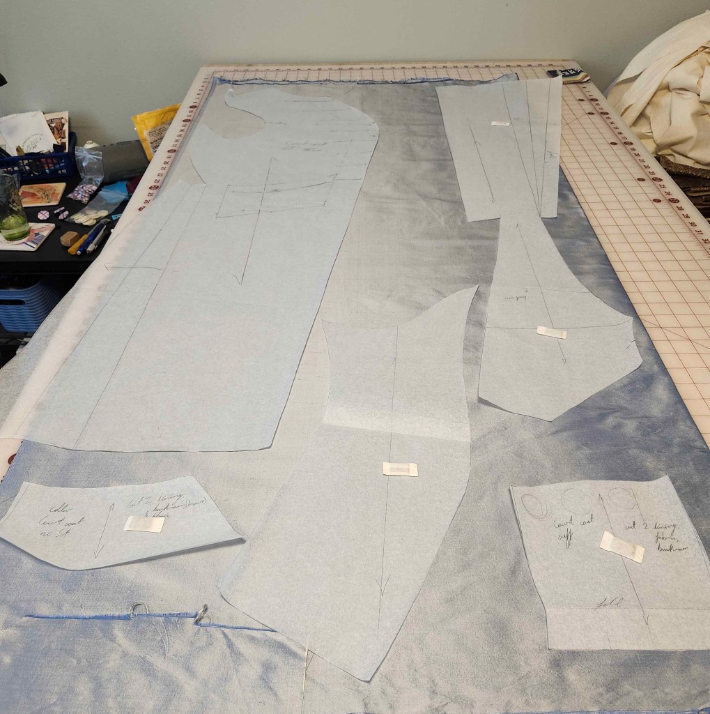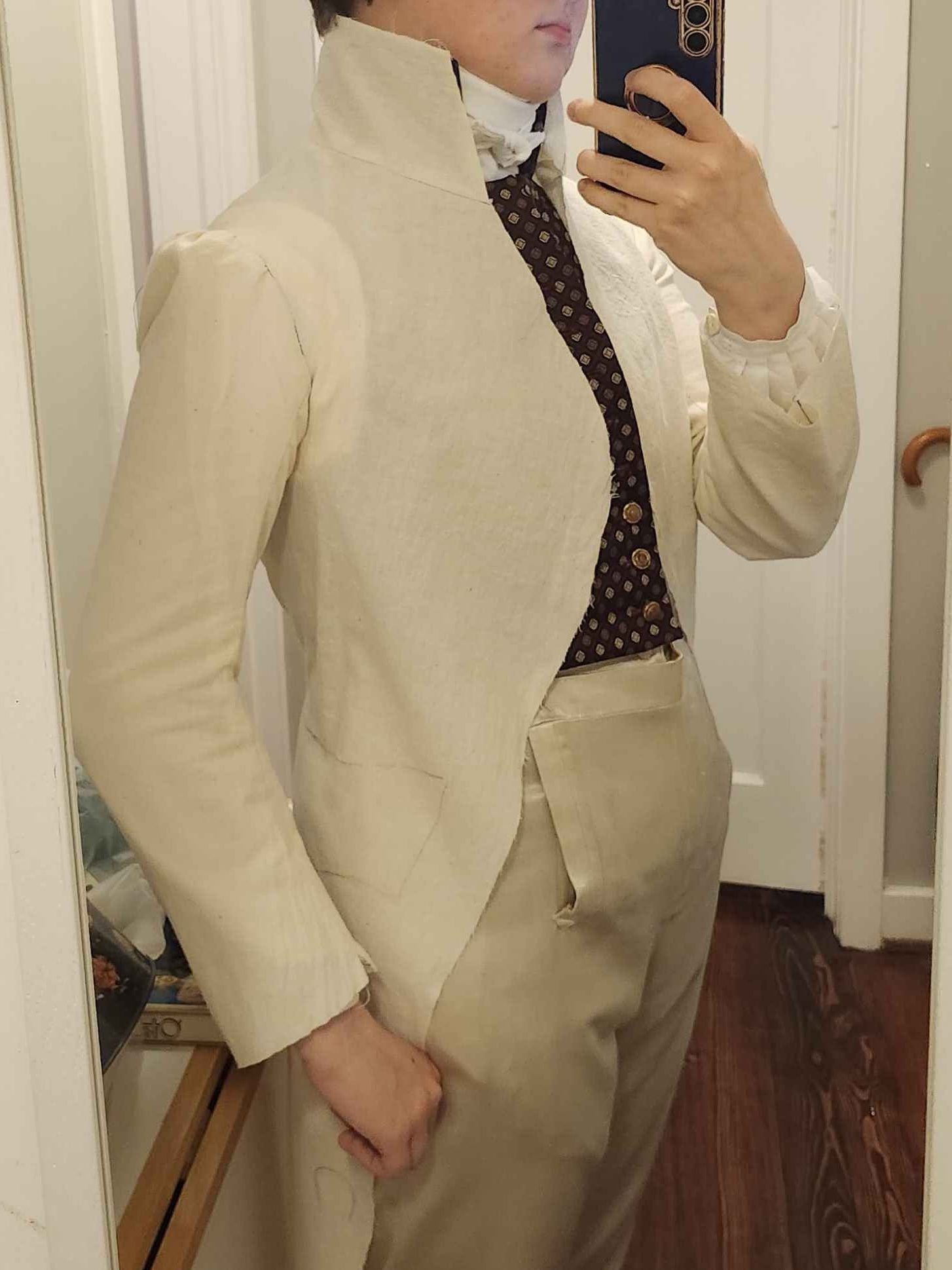 1820s Court Suit with linen shirt, silk coat, silk waistcoat, cotton breeches, and queue bag. Drafted from original and contemporary books. Thread wrapped buttons done by myself.