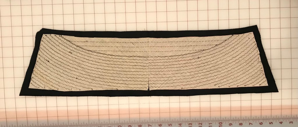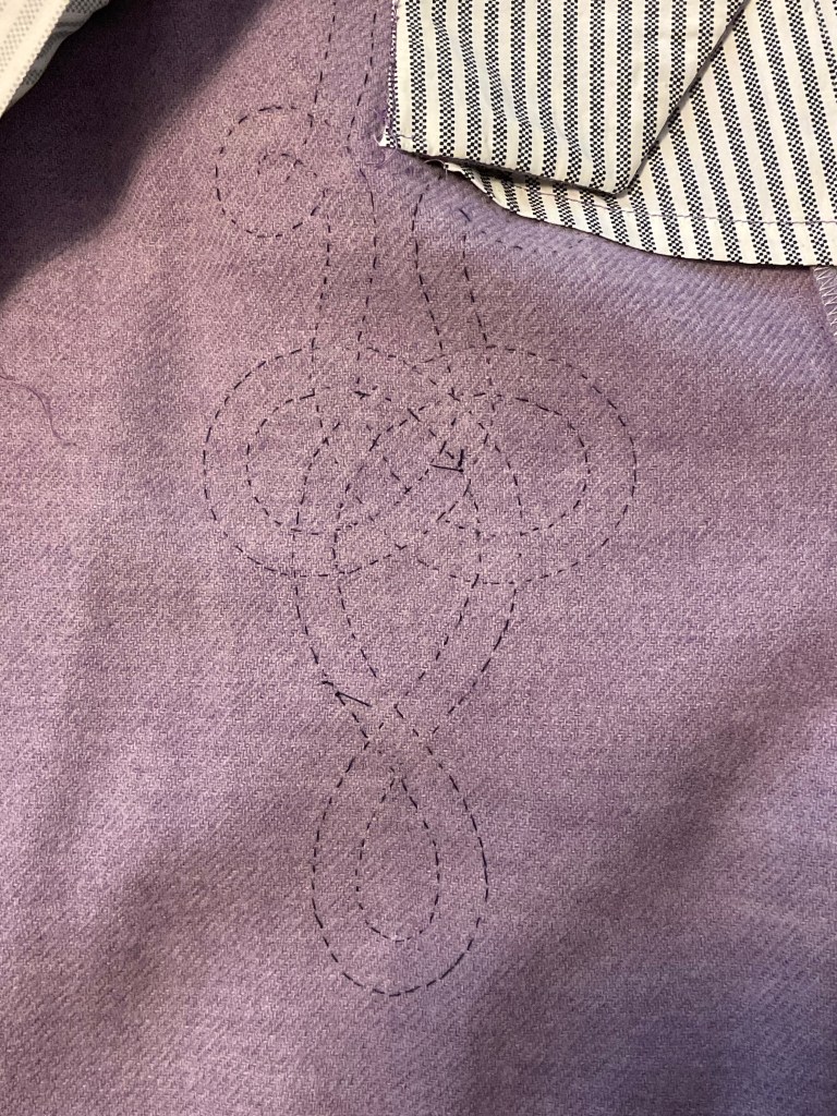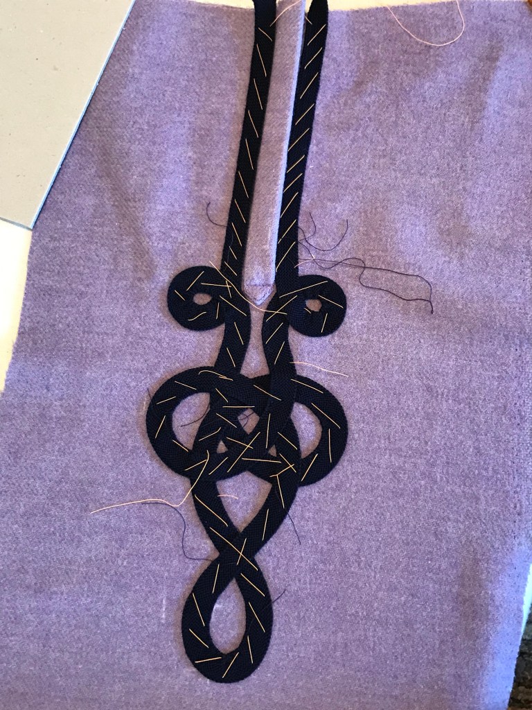 Cape of wool and velveteen. Pantaloons and waistcoat with hand stitched buttons and details. Pleated shirt.